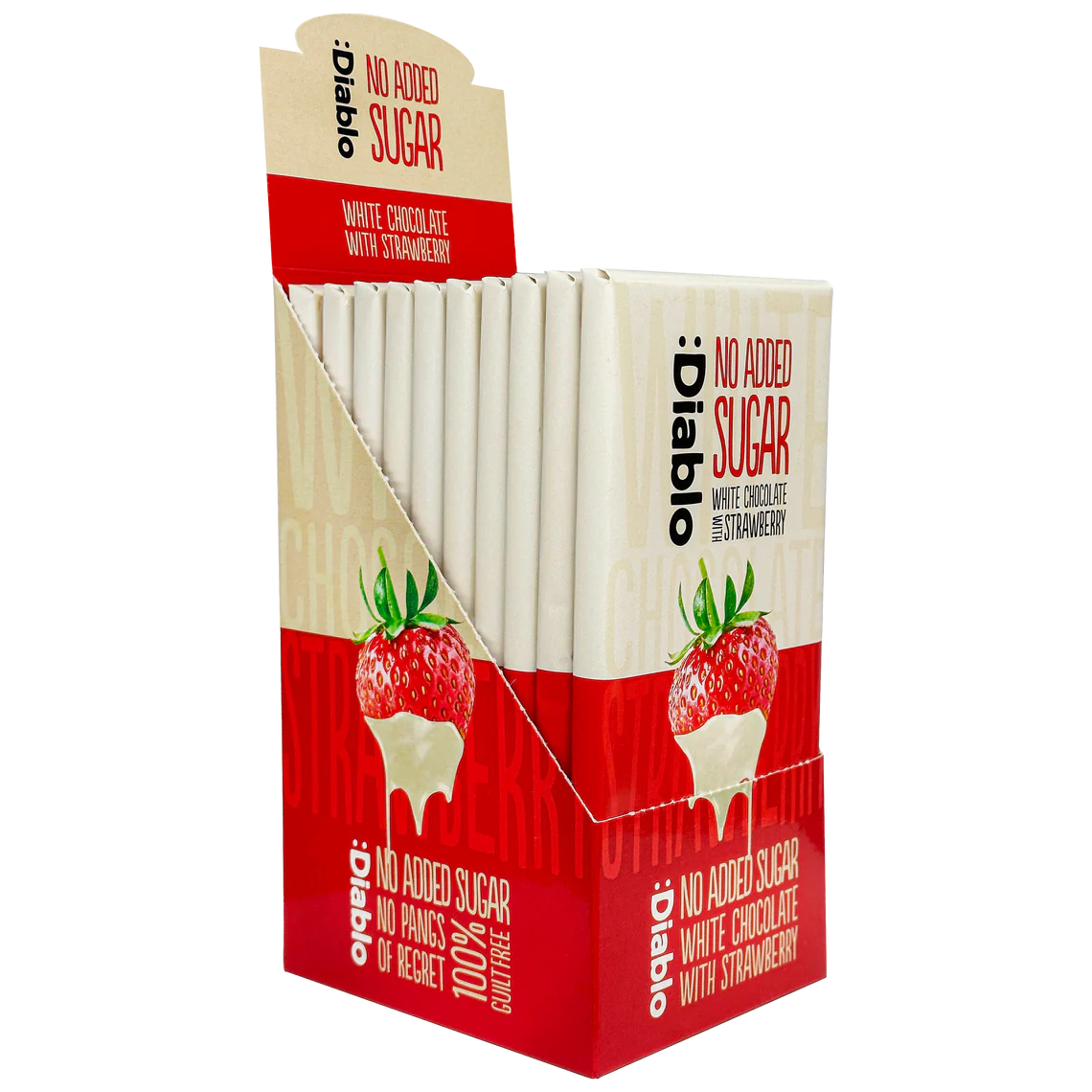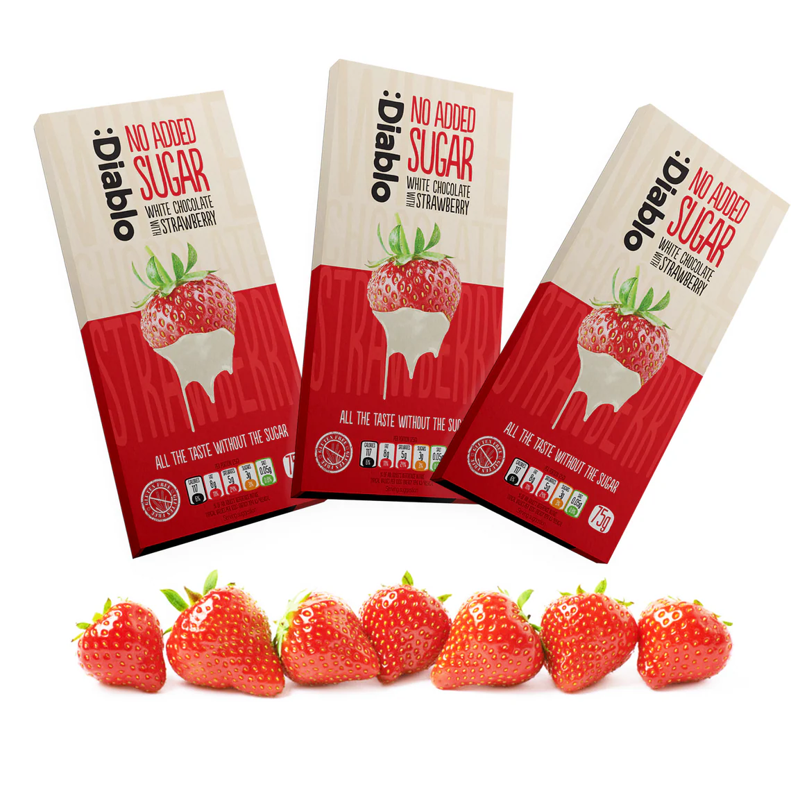 شکلات سفید شیرین و نرم که با توت‌فرنگی تازه ترکیب شده است. این شکلات بدون شکر افزوده است و با مالیتول شیرین شده است.